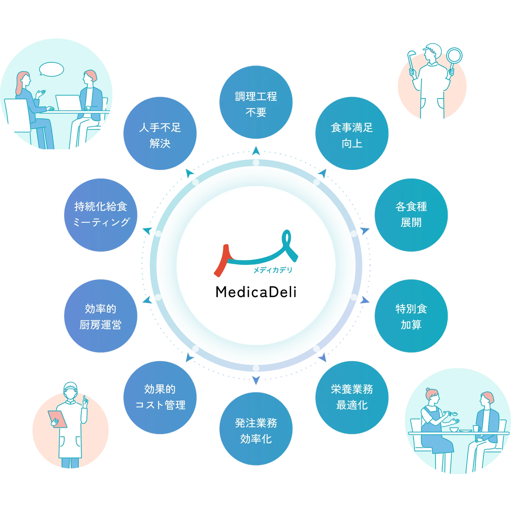 メディカデリの病院食サポートサービスは、いつでもだれでもかんたん便利に、ヘルシーなのに美味しい病院食を最小人員で提供できるようになる、持続可能で最適な病院給食を実現するサポートサービスです。